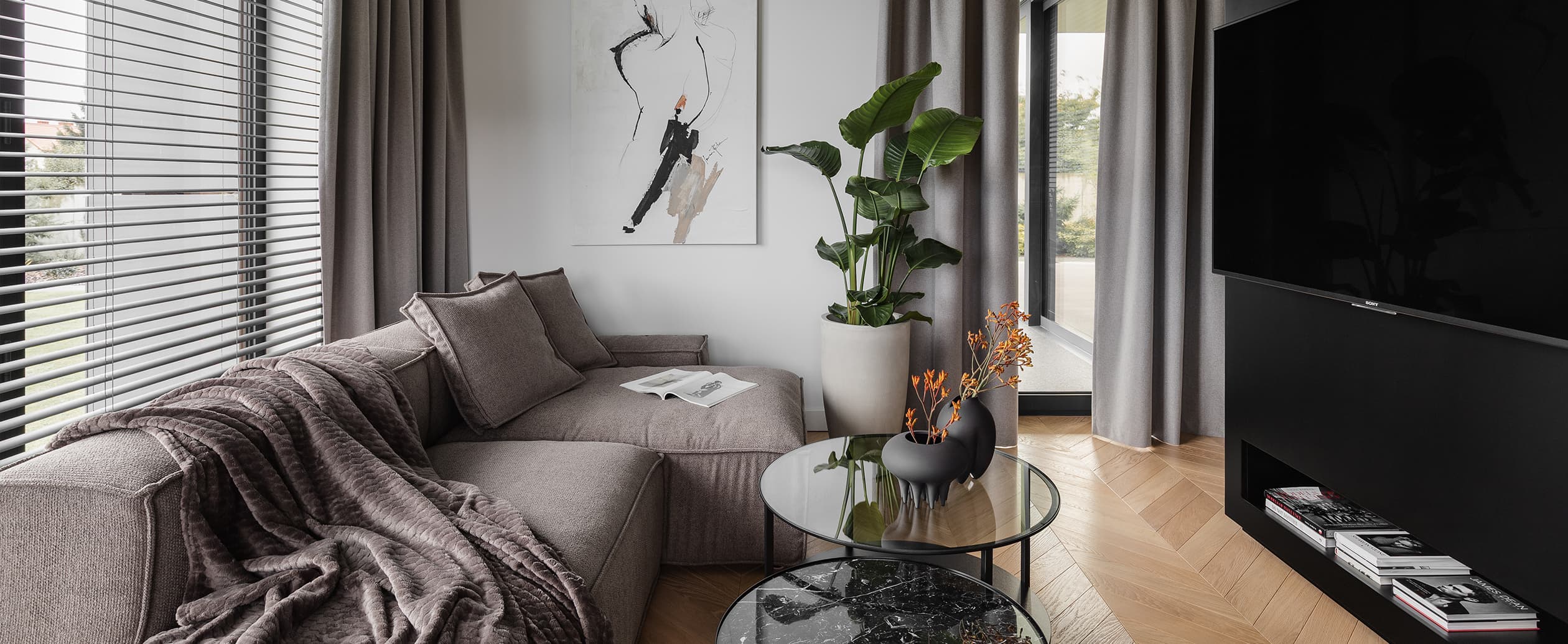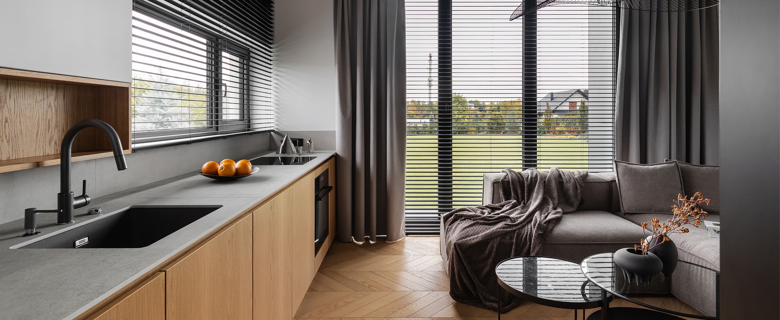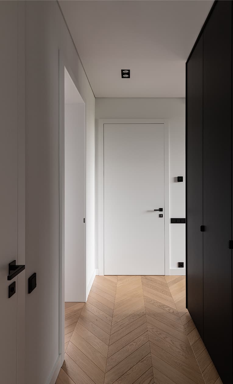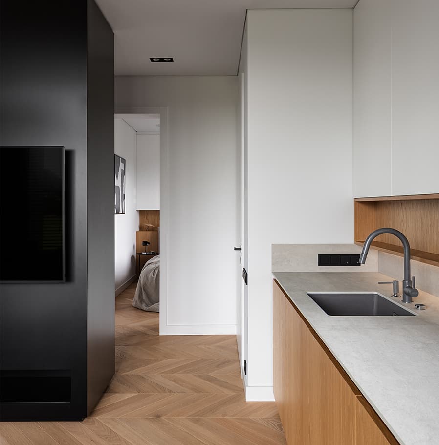 Projekt tego wnętrza powstał z potrzeby stworzenia małej przestrzeni, która będzie funkcjonować jak duża – uporządkowanej, praktycznej i jednocześnie przyjemnej w odbiorze. Podstawowe założenie opiera się na palecie naturalnych materiałów, tj. ciepłe kolory dębowego drewna, stonowane odcienie brązów, szary kamień oraz biel, złamanych jedną płaszczyzną czarnej zabudowy meblowej, która stanowi graficzny akcent wydzielający przestrzeń oraz nadający wnętrzu spersonalizowaną narrację. Serce mieszkania stanowi część dzienna z liniowym, dyskretnie wkomponowanym po lewej stronie aneksem kuchennym oraz częścią wypoczynkową po prawej. Takie założenie porządkuje przestrzeń, czyniąc kuchnię cichym tłem, gdy nie jest potrzebna, a oddając całą przestrzeń w pełni na rzecz funkcji wypoczynkowej.