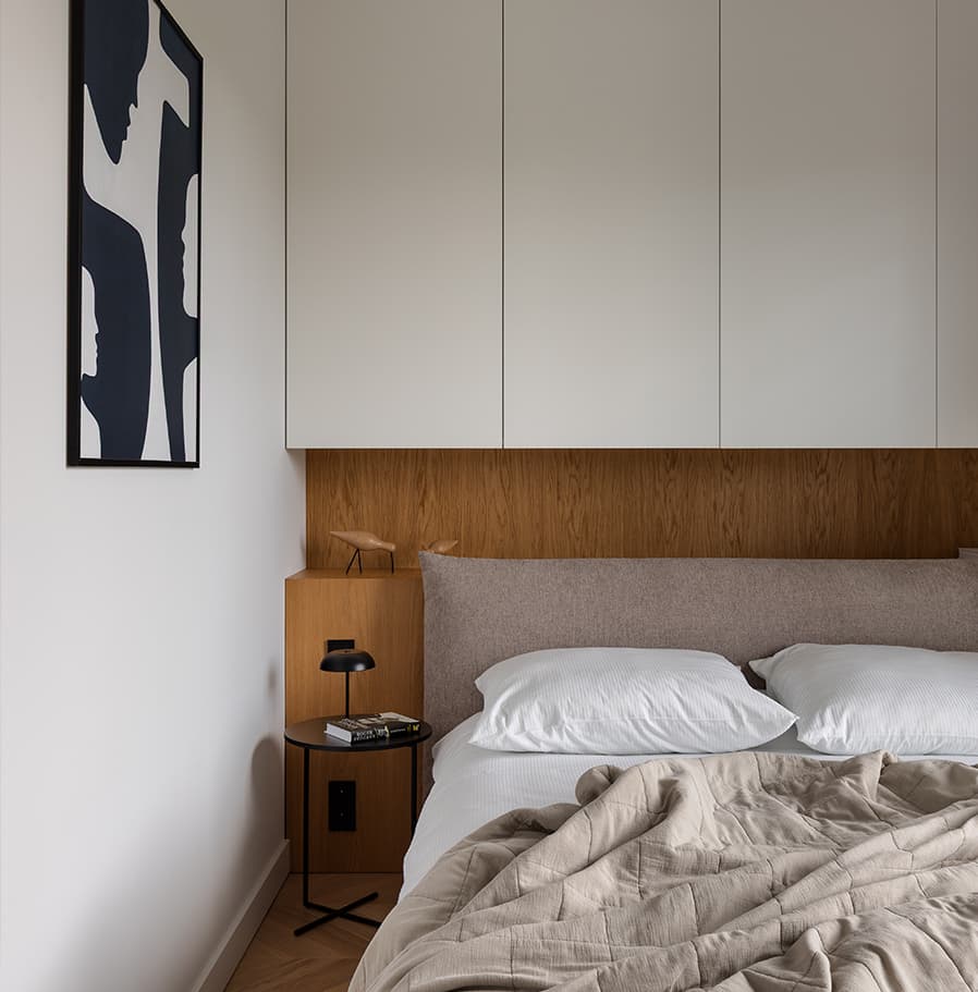Duże okna dają efekt optycznie powiększonej przestrzeń, zapewniając wrażenie większego oddechu i swobody, a zastosowane w nich zasłony w kolorze jasnego brązu ocieplają atmosferę i jednocześnie pozwalają na płynne przenikanie funkcji. Sypialnia została wydzielona jako spokojna strefa prywatna, zachowując tę samą tonacje materiałową, co wzmacnia spójność całego mieszkania. W tym projekcie każde rozwiązanie wynika z przemyślanej potrzeby, a każdy materiał został świadomie wybrany i precyzyjnie wpisany w całość. Mimo niewielkiego metrażu mieszkanie pozostaje funkcjonalne, harmonijne, a także optycznie lekkie. To kompaktowa, dobrze zaprojektowana przestrzeń, w której minimalistyczne rozwiązania oraz zastosowane naturalne odcienie materiałów tworzą wspólnie atmosferę spokoju i ponadczasowej elegancji.